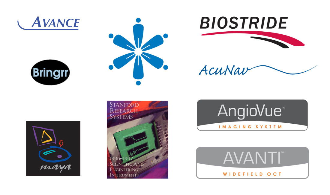 BioCardia Avance logo, Biostride logo, Acuson AcuNav logo, Bringrr logotype, Optovue product labels,